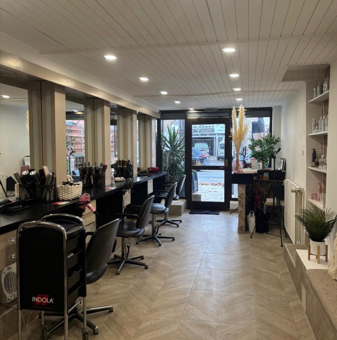 Salon de coiffure Le Palais du Lissage : intérieur moderne et lumineux avec postes de coiffage professionnels, fauteuils de salon, miroirs, sol en bois clair et décoration élégante beige.